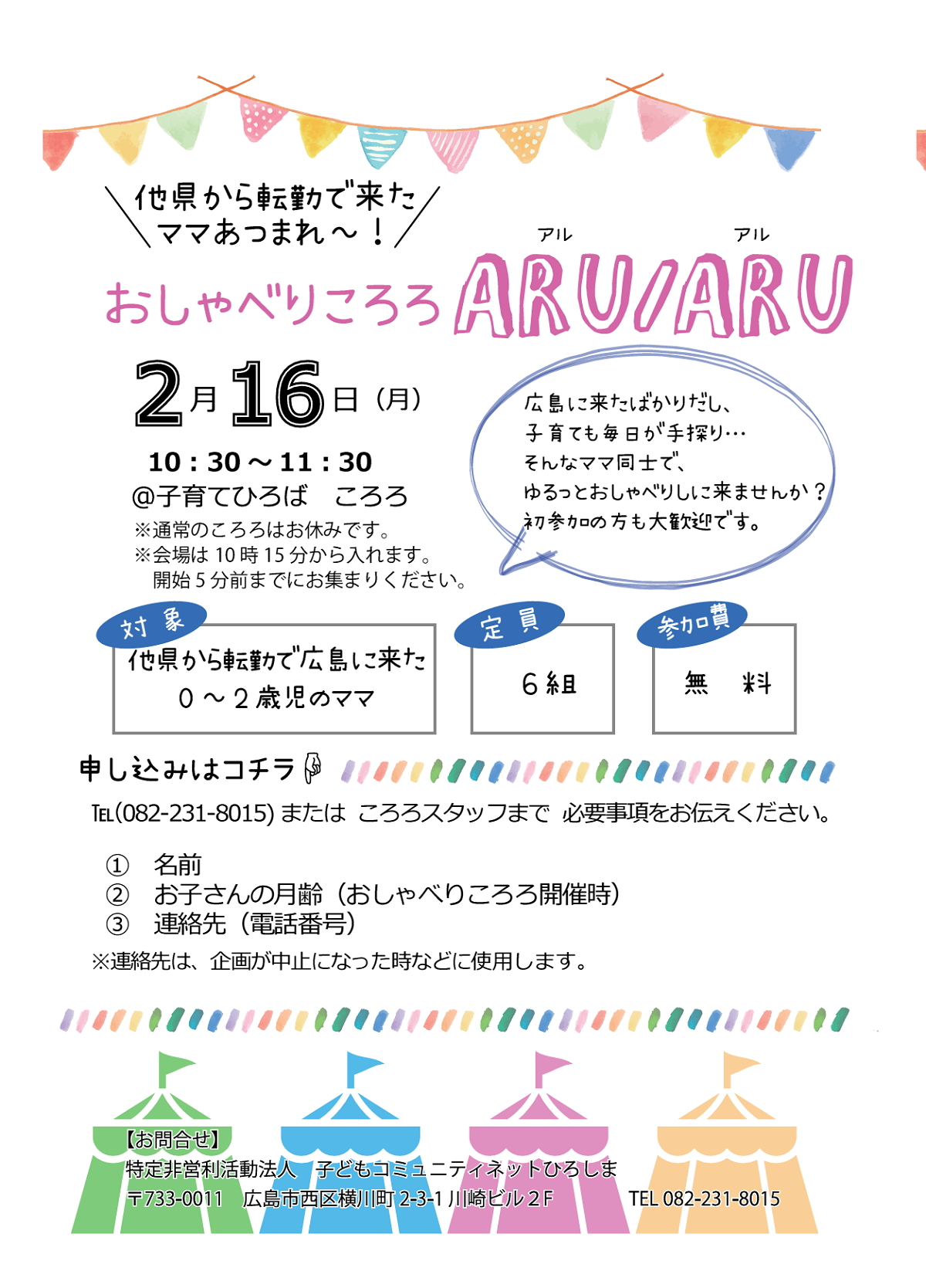 | |トップ|子どもコミュニティネットひろしまについて|子育てひろば“ころろ”|おやこ体験ひろば“あるて”|えほんであそぼう“ゆるぐ”|シアター|メール| |