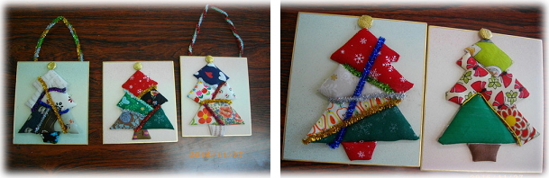 布、ボタン、リボンなどを使って楽しい作品ができました。